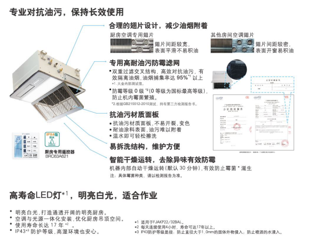 首先,它采用厨房空调专用翅片,翅片的间距较宽,表面平滑不易积油,配合专用防霉滤网能有效隔离油烟进入室内机。同时,采用了抗油污材质面板,使油污难以附着在机器表面,并且面板可以用温水轻松擦洗,这些都是对空调本身的保护。专用的空调遥控器面板上也会进行过滤网更换的提醒设置,不用担心油污对空调的影响。