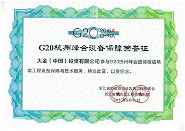 拥有九十余年历史及雄厚实力的大金空调倾力入驻G20杭州峰会,为这一年度盛事提供了贴心出色的接待场馆工程设备服务保障,协力打造舒适高效空间,得到浙江省饭店业协会等单位的充分肯定和表扬,更赢得了服务监管部门及各国重点来宾们的充分认可和赞誉。